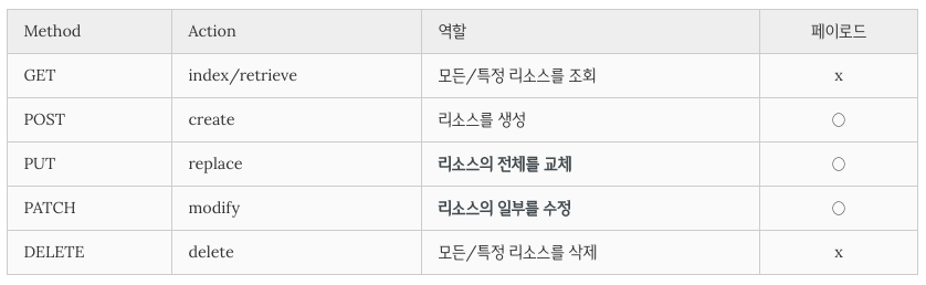 - HTTP Method(GET, POST, PUT, DELETE)를 이용해 리소스에 대해 *CRUD 명령을 적용