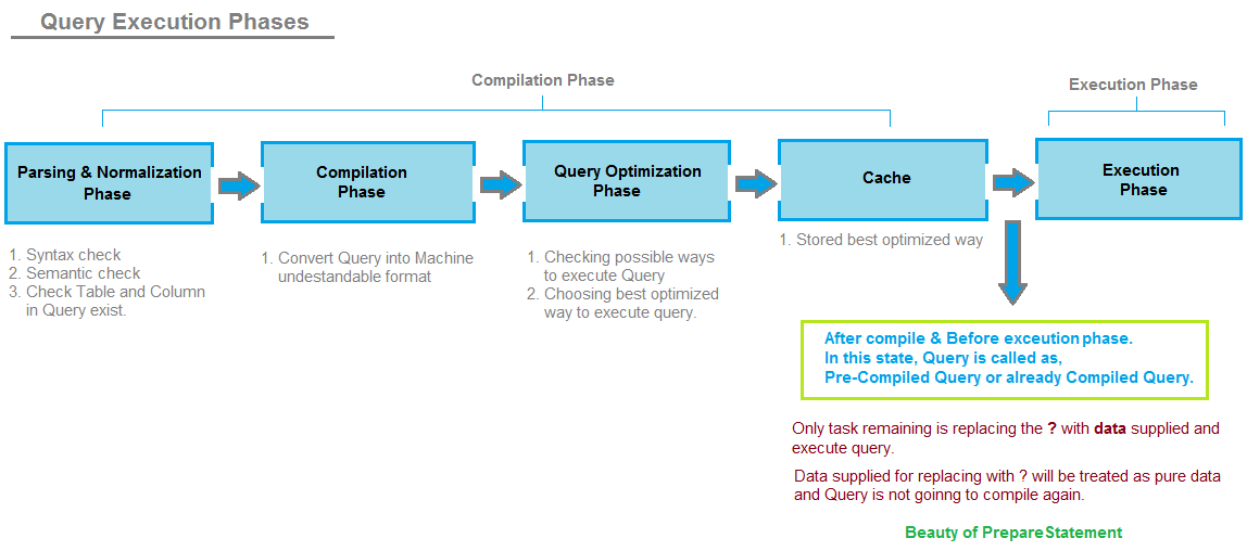 | 매번 쿼리를 할때마다 컴파일을 하기 때문에 성능상의 이슈가 있을 가능성이 있다. | 미리 Statement를 컴파일 실행하기 때문에 성능상 이점이 있다. |