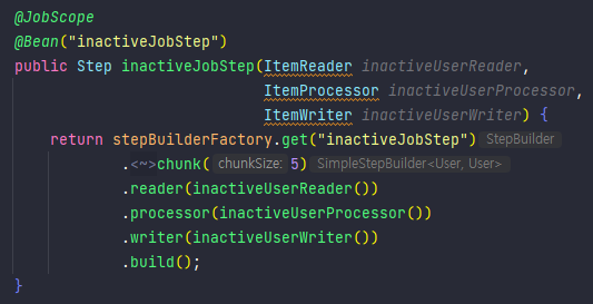 위와 같이 InactiveUserJobConfig 를 구성하였으며,