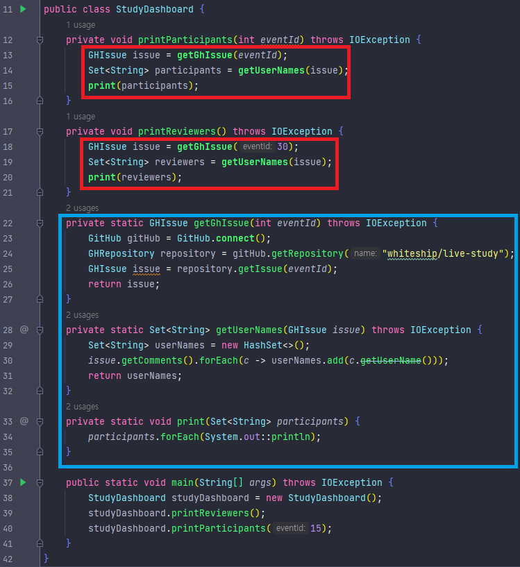 (ex) getGhIssue(), getUserNames(), print()