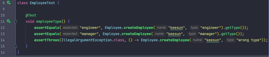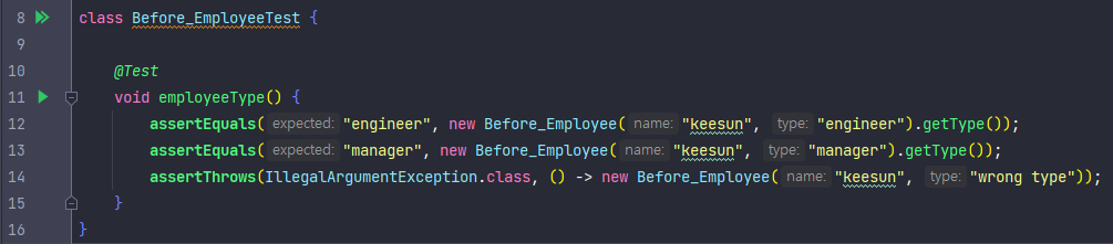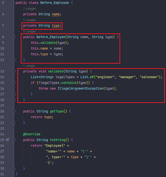 - 리팩토링 이전에는 Employee 클래스에서 직원 타입을 분리하기 위해 내부 필드 type 의 문자열 값으로 구분하고 있다.
