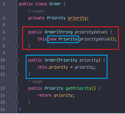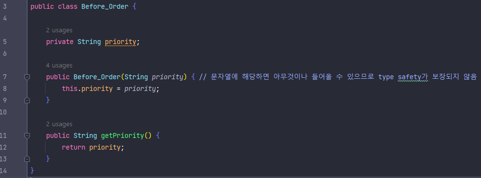 - Order 클래스에서 우선순위를 의미하는 prioirty 필드를 기본 자료형으로 사용하고 있으며