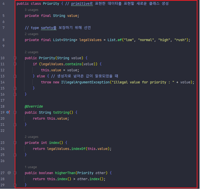 - 우선순위는 String 형식이긴 하지만, 한 번 더 Priority 클래스로 감싸는 방향으로 리팩토링한다.