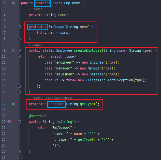 - Employee 클래스에서 팩토리 패턴으로 타입에 해당하는 서브 클래스를 생성한다.
