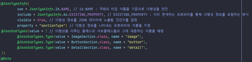 "sectionType" 이라는 필드의 값이 "image"면 ImageSection을 DTO로 인식하게 된다.