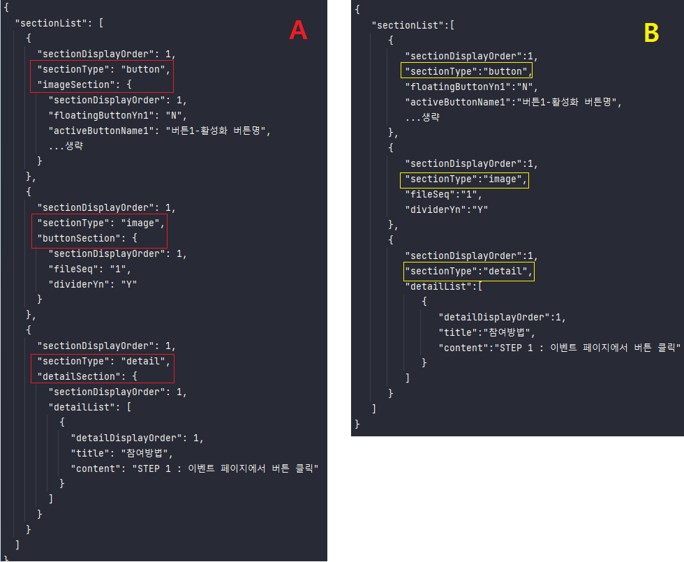 "imageSection" , "buttonSection", "detailSection" 과 같은 필드가 따로 따로 생기는 방식이었다.