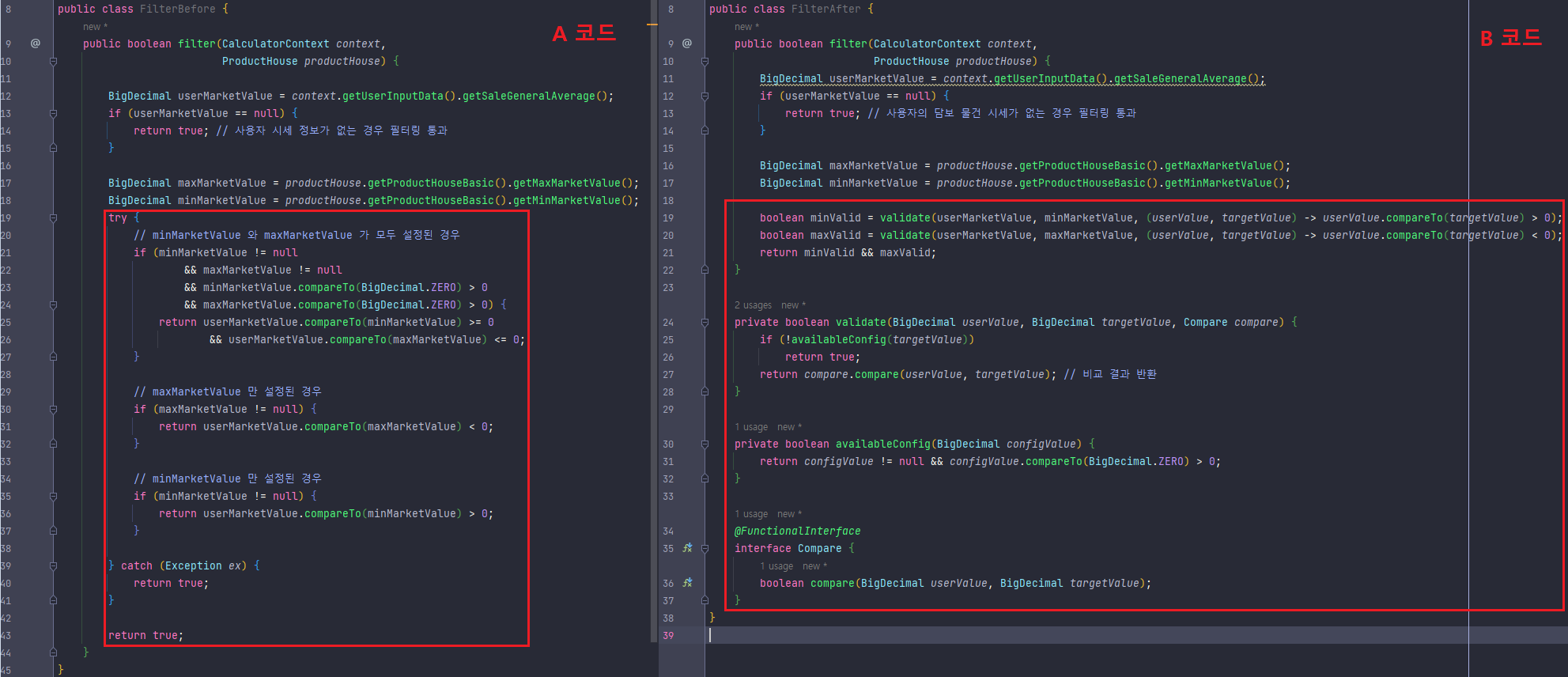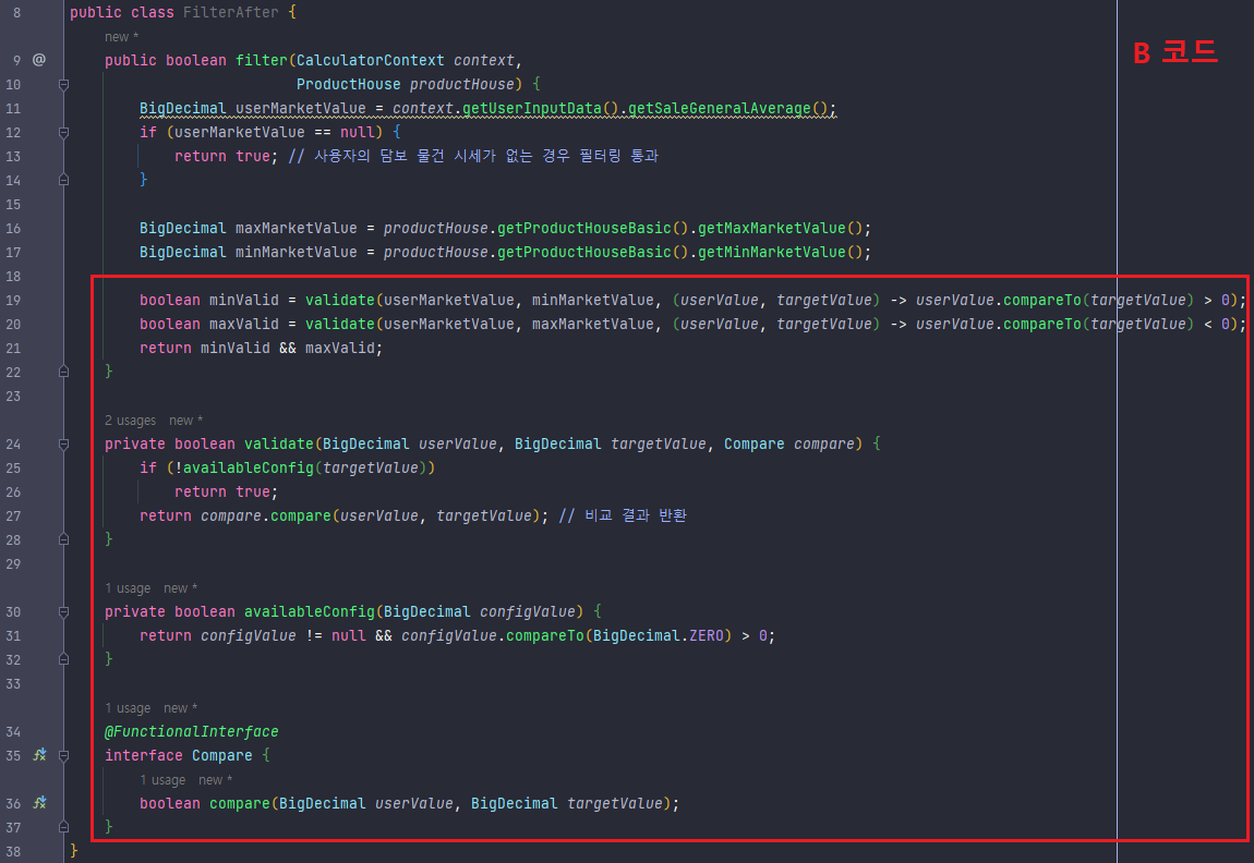 B 코드에서는 validate 메서드 내에서 람다 표현식을 사용하여 비교 조건을 간결하게 정의한다.
