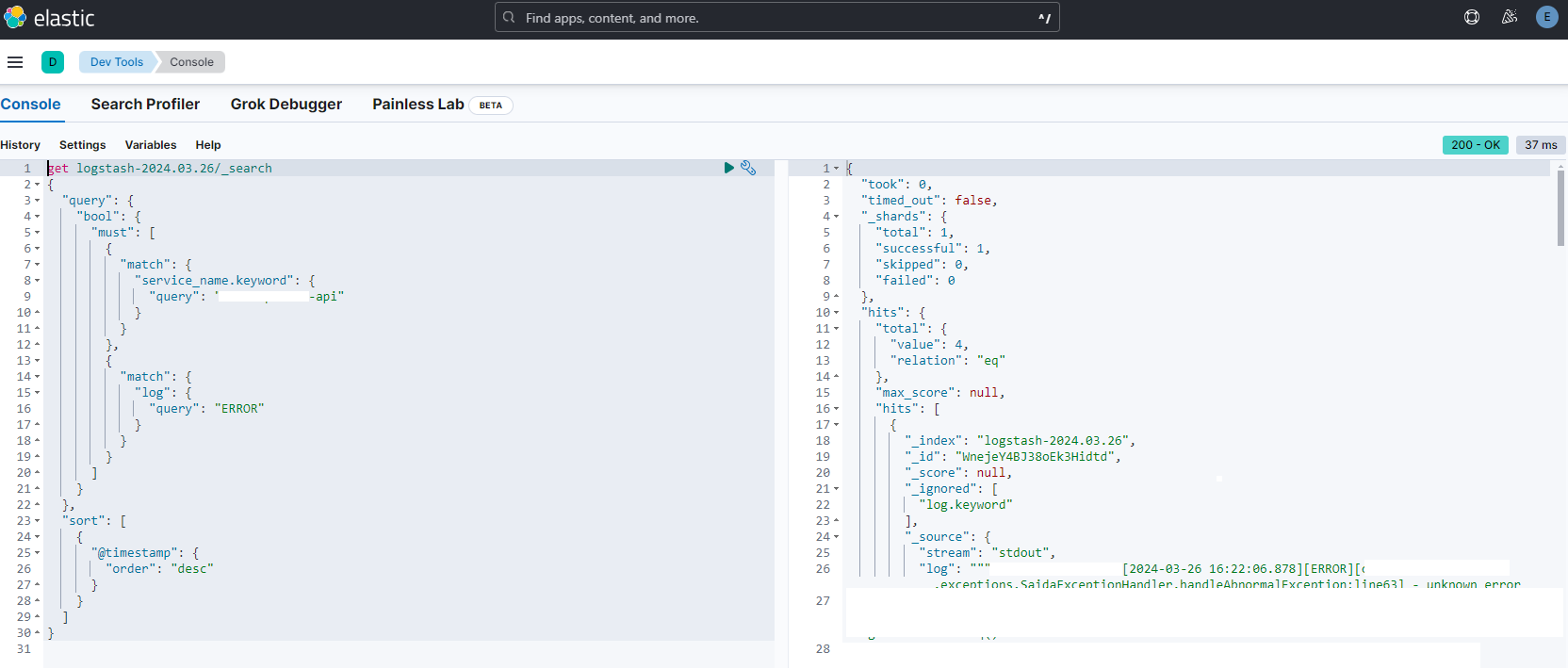 그리고 Kibana의 Devtools 메뉴의 console에서