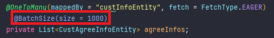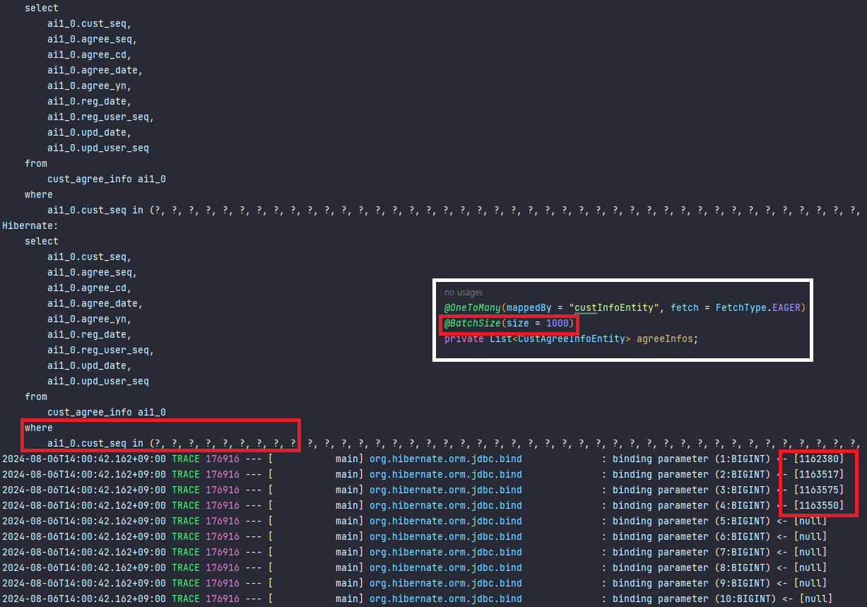 - Hibernate는 여러 개의 cust_agree_info를 배치로 로딩하여 단일 쿼리로 조회할 수 있음.