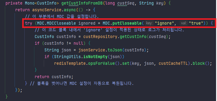- MDC.putCloseable("ignore", "true")를 사용하여 비동기 스레드에서도 MDC 값을 설정한다.