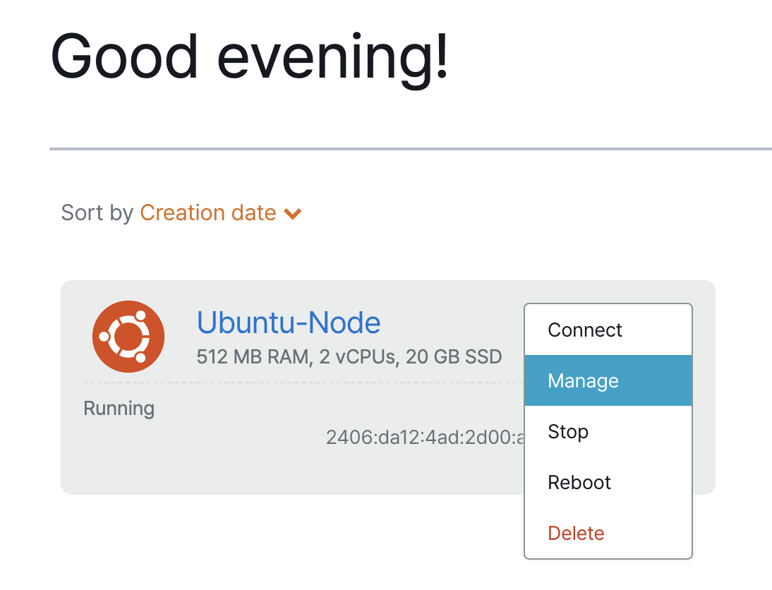 인스턴스가 생성되면, Manage 메뉴를 클릭해서