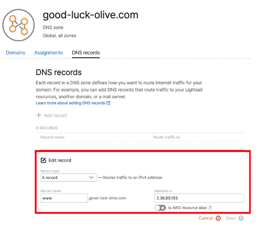 이 lightsail의 네임서버를 등록해 주어야 한다.)
