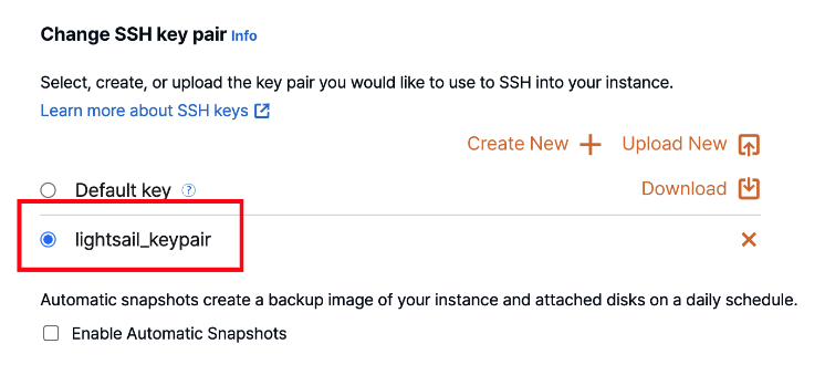 나같은 경우 이미 생성해서 lightsail_keypair 을 선택할 수 있도록 되어있는데,