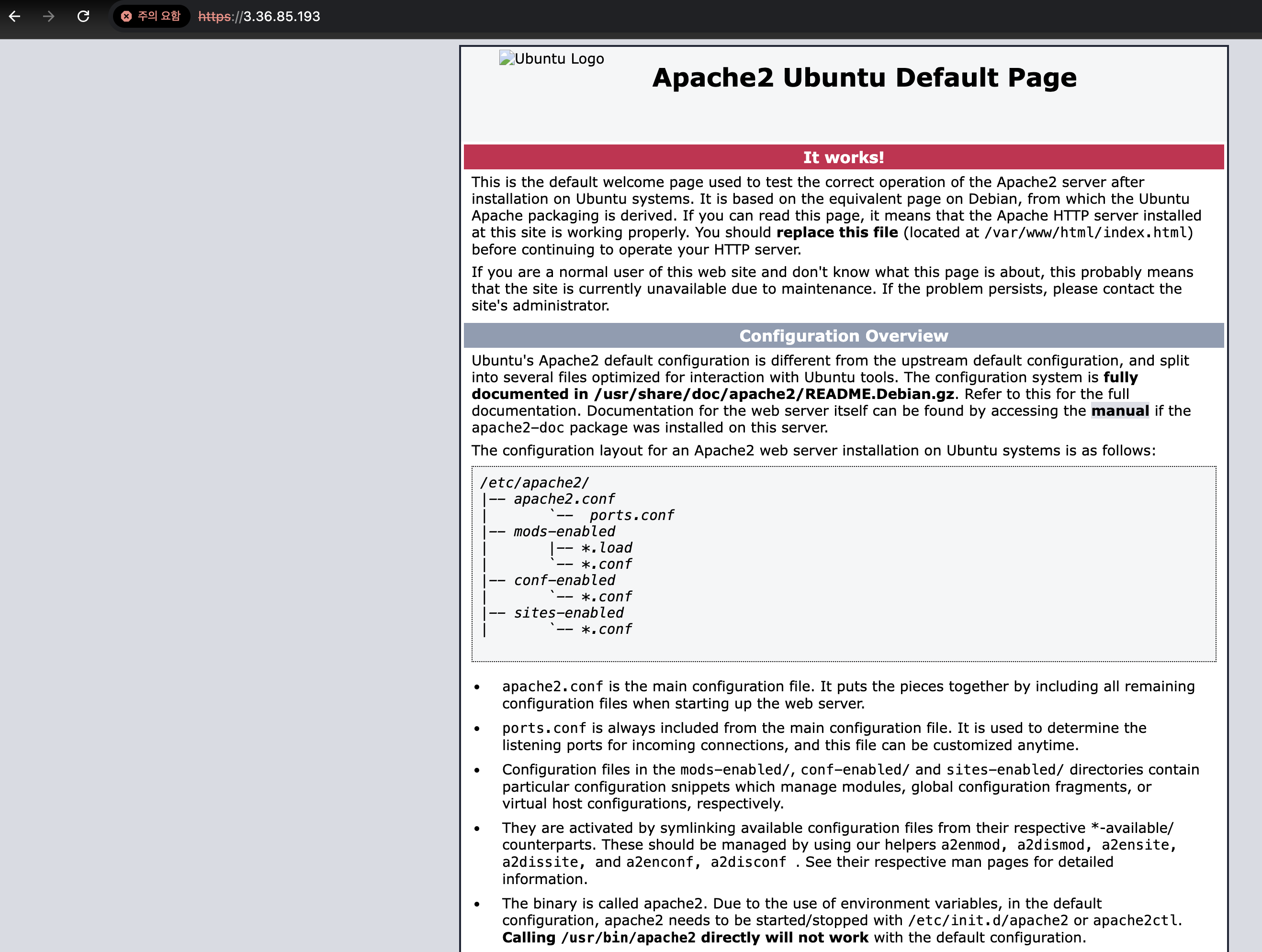 브라우저 주소창에 lightsail에서 할당된 아이피를 입력해보니 잘 접속되었다.