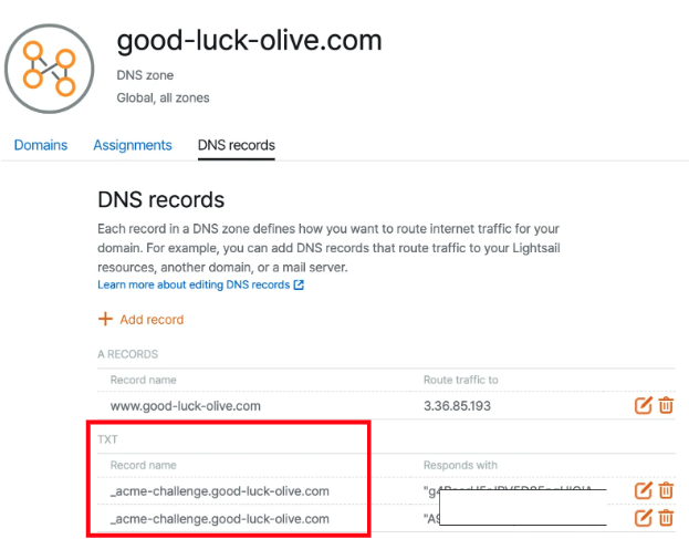 (ex) _acme-challenge.good-luck-olive.com에 제공된 값으로 TXT 레코드를 추가해줬다.
