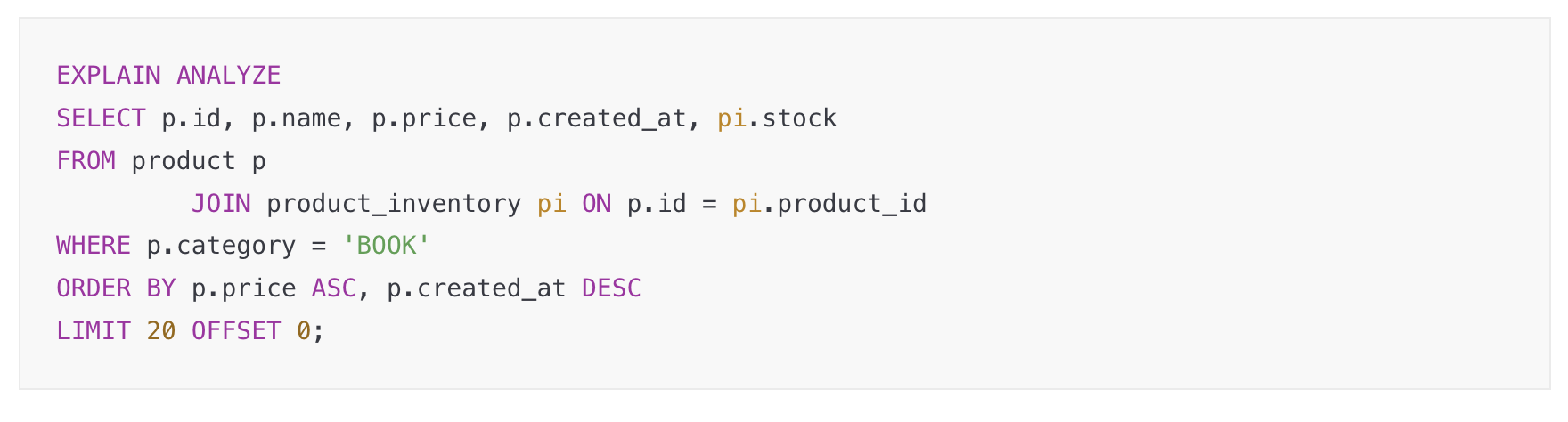 CREATE INDEX idx_price_created ON product(price ASC, created_at DESC);