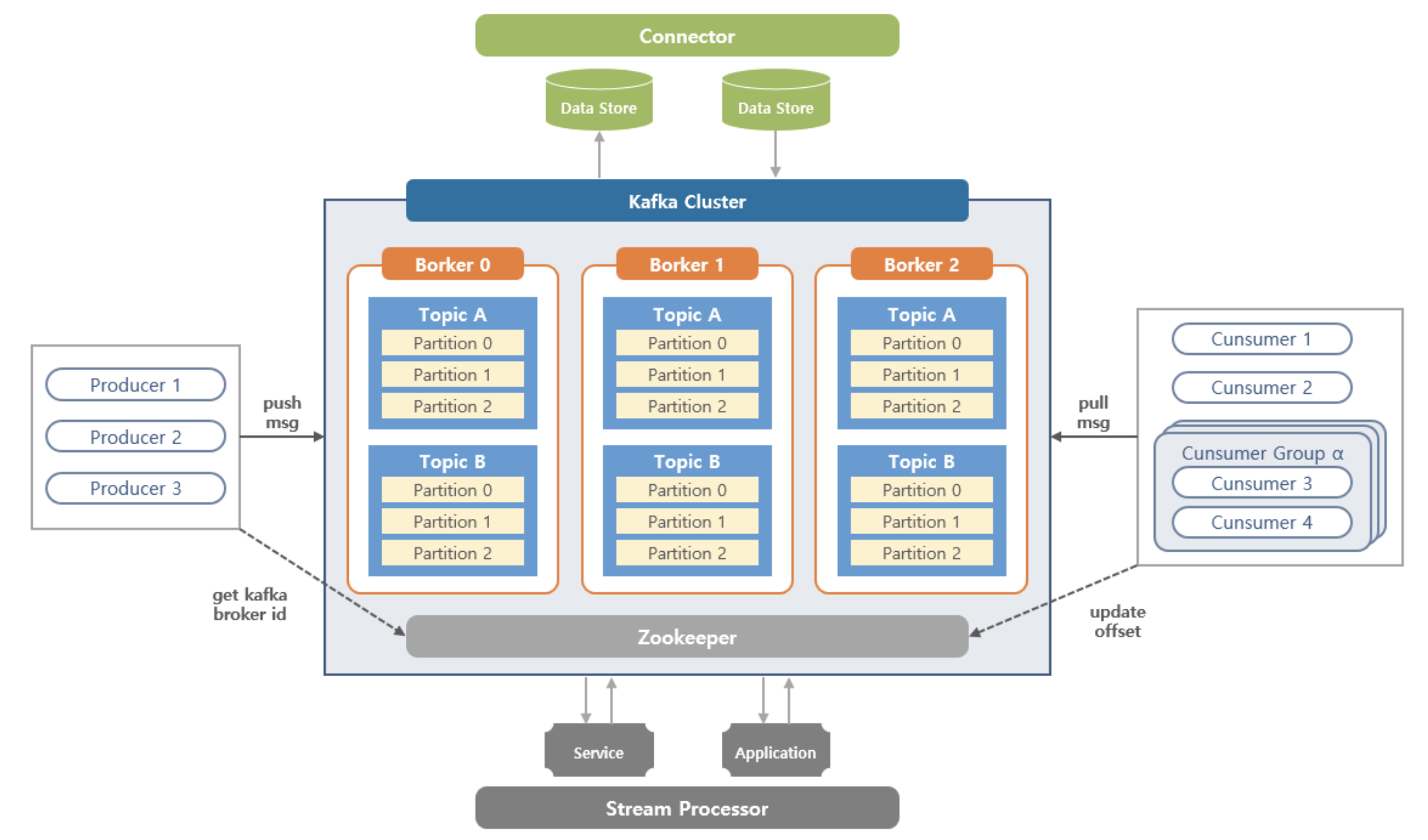 - 하나의 Kafka 클러스터는 여러 브로커로 구성
