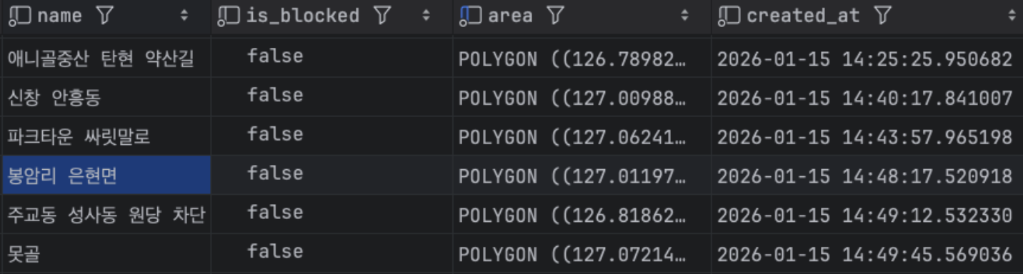 테이블의 area 필드에는 아래와 같이 저장됩니다. (단순 예시 이미지)